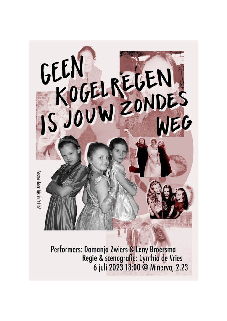 Poster design for the theater production “Geen kogelregen is jouw zondes weg”, a performance exploring the themes of youth, identity, and growing up. The design combines soft pink tones with a collage of old and new photographs, layered textures, and handwritten text. This mix of intimate and raw visual elements mirrors the personal and searching character of the piece.